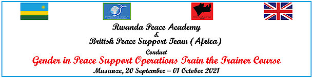 The Gender in Peace Support Operations Train the Trainer (T3) Course will start on Monday, 20 September 2021 at the Rwanda Peace Academy (RPA) training facility in Musanze and run up to 01 October 2021. The course is funded by the Government of the United Kingdom (UK) and is organised in partnership between the British Peace Support Team, Africa (BPST-A) and the Rwanda Peace Academy.