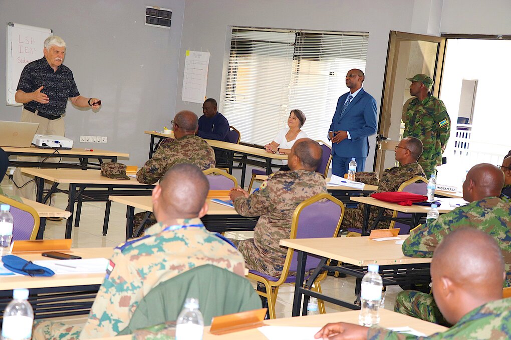 Lt Gen (Rtd) Romeo Dallaire gives a lecture to the EASF military officers who are currently attending the African Union Military Experts on Mission Course at the RPA.