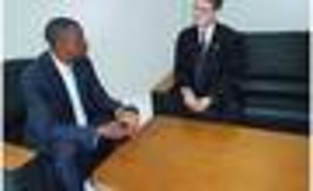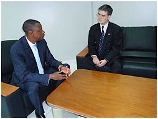 Minister of Defence, Gen James Kabarebe, with Brigadier (Rtd) Gordon Hughes of the Geneva Centre for the Democratic Control of Armed Forces (DCAF) during a courtesy call at MINADEF on 11th March 2011